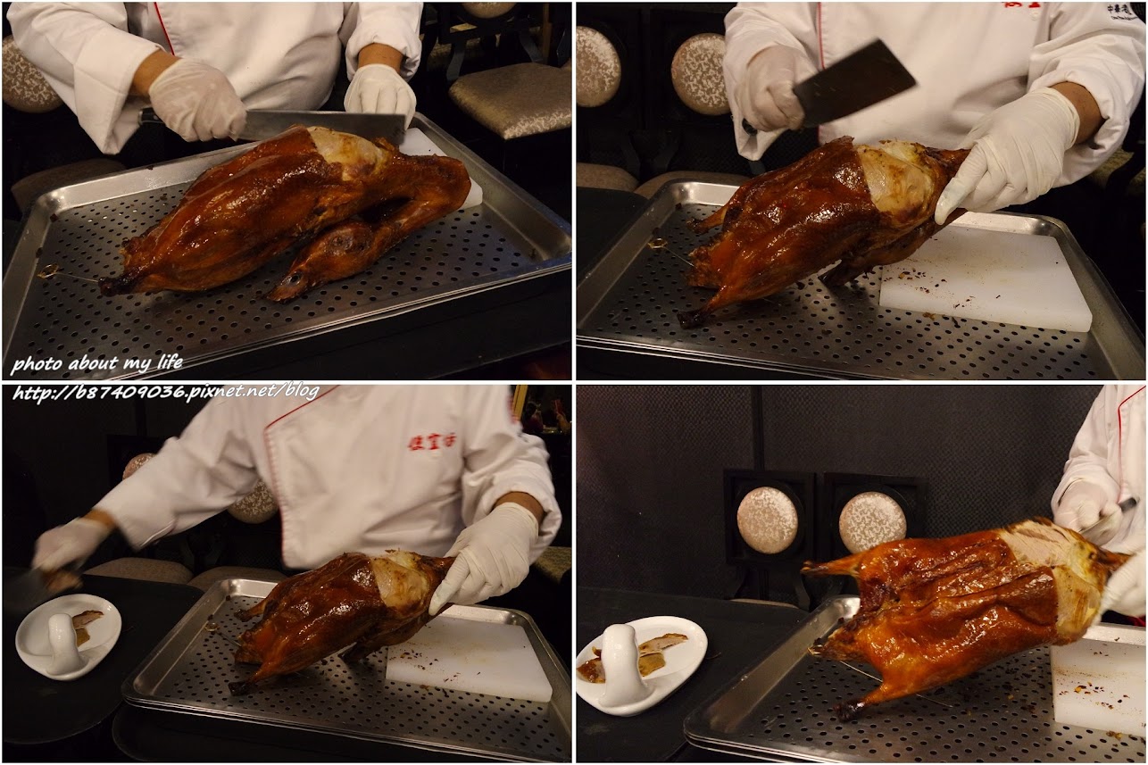 每桌上烤鴨十都會聽到超大音量的吆喝聲 類似京劇的腔調很新鮮但久了就覺得有點吵 時不時還被嚇到(